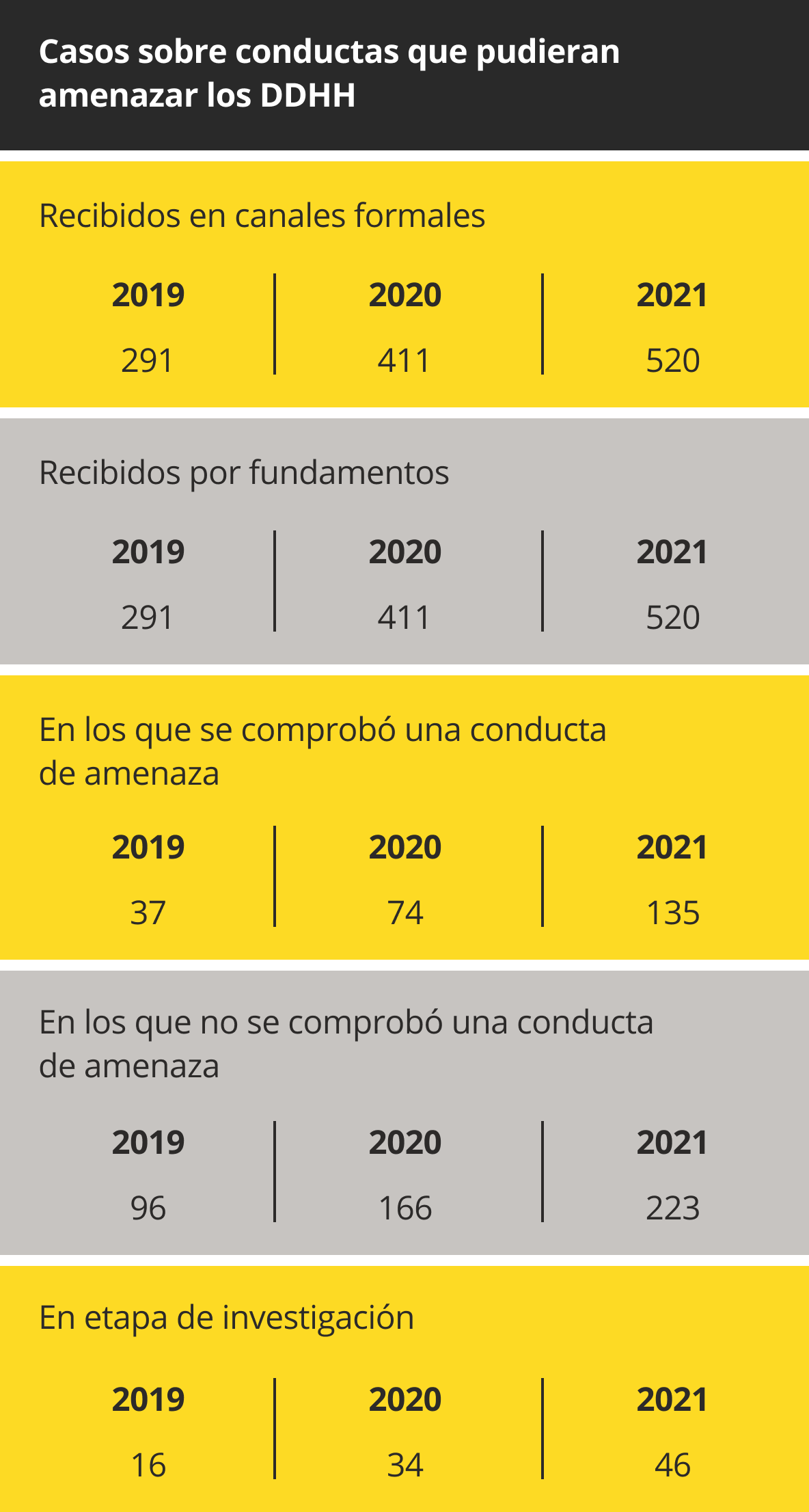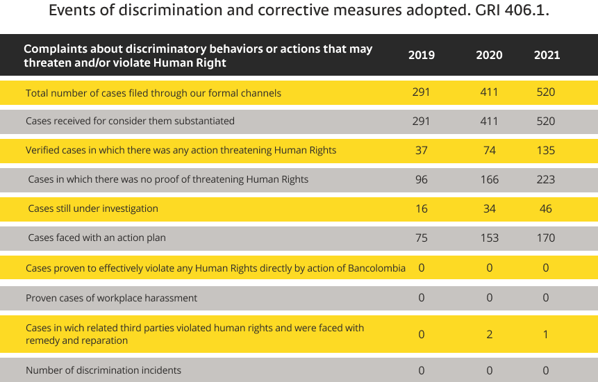 In 2021, the Ethics Hotline was most used by our stakeholders. Collaborators also use the coexistence committee, established under Colombian and Panamanian regulations, that investigates workplace harassment complaints. There was one (1) case where related third parties violated human rights, and remediation measures were immediately implemented. We investigate all cases under strict parameters of neutrality and confidentiality.