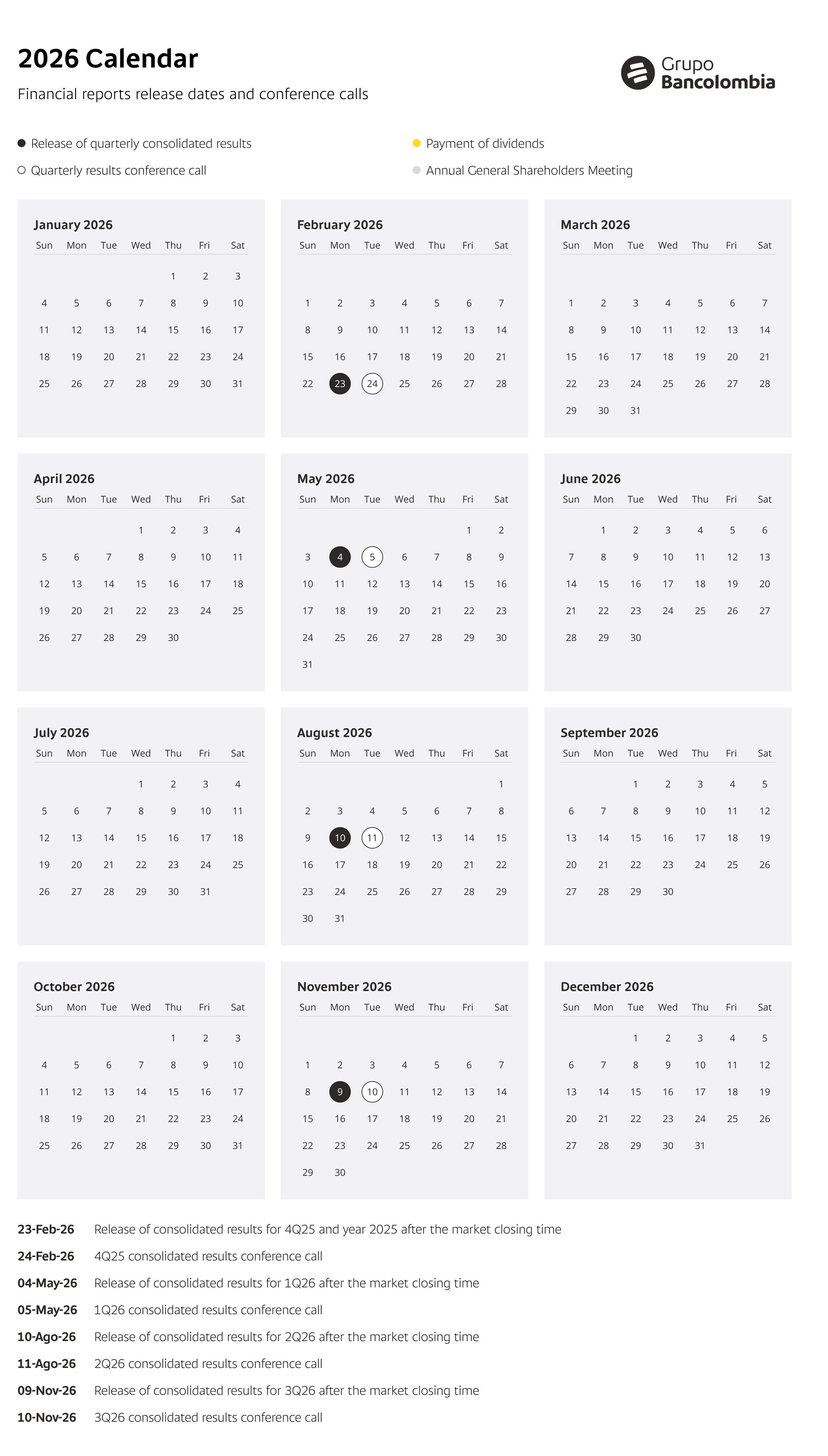 Financial Calendar - Information of Interest | Grupo Bancolombia