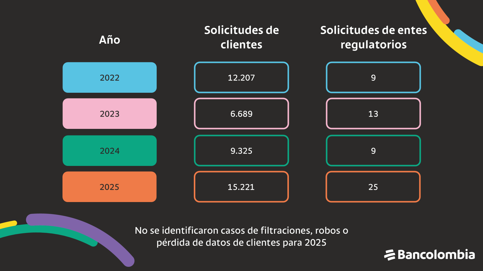 Por eso, Bancolombia ha adoptado directrices claras sobre las solicitudes de los interesados, capacitamos a nuestros colaboradores y nos mantenemos atentos para recibir y gestionar este tipo de solicitudes.